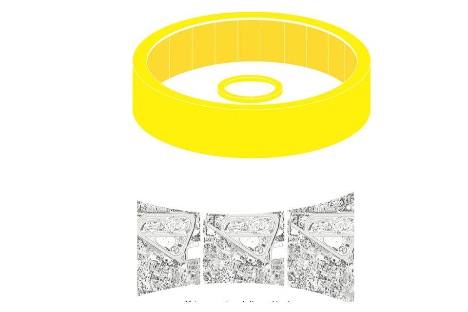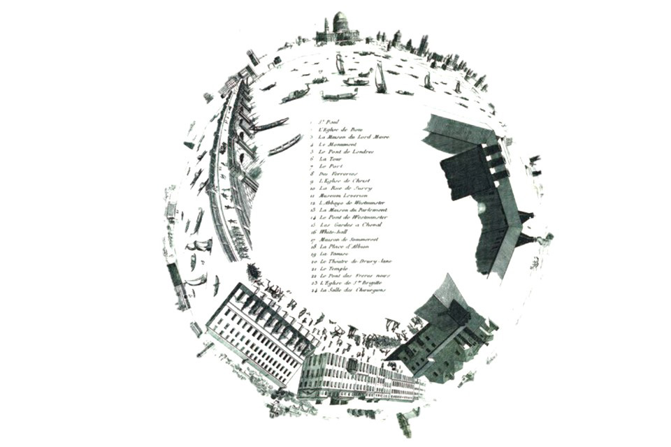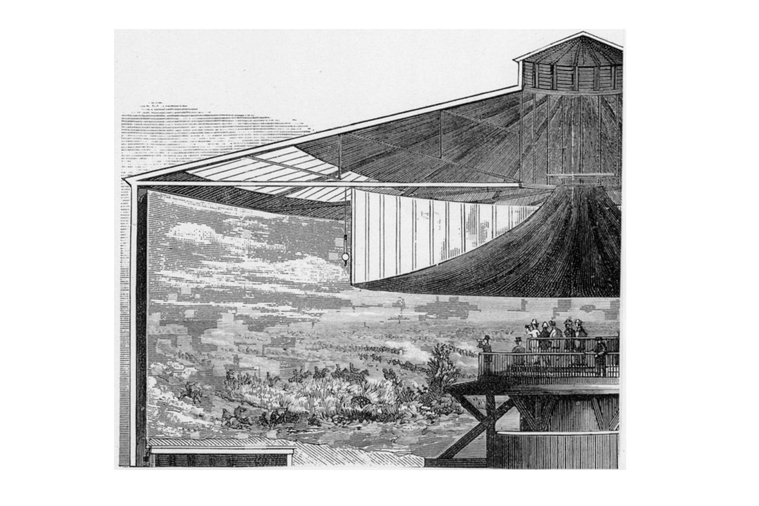 Mais le panorama « sportif » imaginé pour l’Arsenal est bien différent de celui inventé à la fin du XVIIIe siècle par le peintre anglais Robert Baker et développé par l’Américain Robert Fulton. Il n’est pas ce procédé qui crée l’illusion d’une vision réelle à partir d’une toile peinte de forme arrondie observée depuis le point central de la construction perspective et éclairée par le haut. Ce panorama-là participait à la construction de l’universel, à la célébration d’une ode à l’universalité propre au XIXe siècle[1], avant d’être détrôné par l’invention du cinéma.