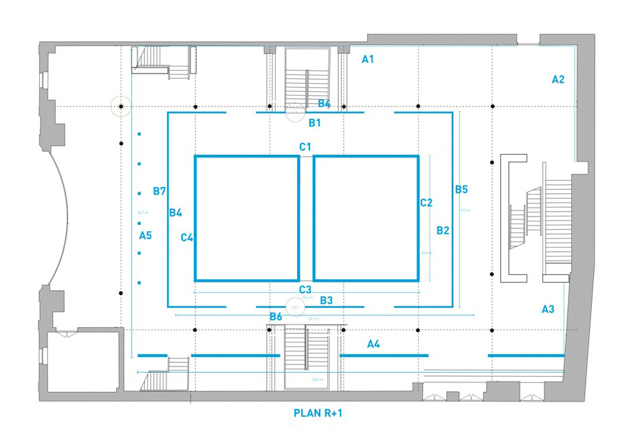 La galerie d’exposition du Pavillon de l’Arsenal est située au premier étage d’un ancien hangar rectangulaire. Elle tourne autour d’un vide central éclairé par la lumière naturelle zénithale d’une verrière disposée au sommet de la charpente à deux versants. Une certaine dramaturgie spatiale organise déjà ce lieu conçu par Reichen et Robert en 1988, dans le sens où au rez-de-chaussée plutôt sombre succède l’étage lumineux d’une plate-forme qui offre des points de vue sur au moins trois paysages : deux à l’intérieur – l’un sur les cimaises tournantes de la galerie, l’autre sur le parterre situé en contrebas – le troisième étant la vue extérieure sur la ville, que l’on perçoit à travers la fenêtre thermale. L’organisation de cet espace, avec son balcon et son orchestre, est théâtrale et ordonne les relations sociales des soirées de vernissage dans des jeux de regards entre voir et être vu, entre montrer et cacher.
