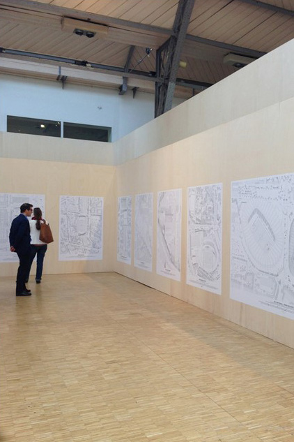 La galerie intérieure est conçue comme un espace rectangulaire panoramique qui se laisse embrasser d’un seul regard depuis l’escalier montant à la plate-forme. Sur cette cimaise quadrangulaire sont présentées vingt-sept figures axonométriques  exemplaires des rapports qu’une pratique sportive peut entretenir avec l’espace métropolitain. Les conventions graphiques de ces perspectives militaires sont identiques : figures au trait noir sur papier blanc avec un même angle plongeant. Chaque figure est ainsi guidée par la même quête : celle de constituer une vue totalisante inscrivant chaque terrain de jeu ou de sport dans un contexte urbain, en leur accordant une valeur qualitative identique dans la fabrication de la ville, par le truchement d’une représentation géométrique dont les huit échelles retenues  permettent de donner, sur les panneaux, une taille équivalente à des équipements aussi dissemblables qu’un stade de football de 40 000 places ou une piste de skate construite dans le jardin d’un maison pavillonnaire. L’ensemble de ces documents de près d’un mètre carré constitue de la sorte une collection unifiée de terrains de jeux remarquables, malgré leur nature et leurs formes très diverses.