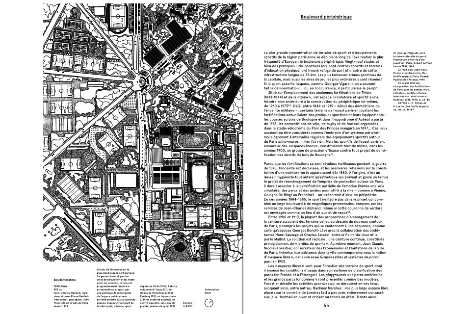 Ce panorama retranscrit un voyage en Île-de-France mettant en exergue des situations urbaines et les pratiques sportives exemplaires qui s’y développent. Il procède d’une esthétique de la mise à plat par l’axonométrie qui, modérant le sentiment – l’émoi, le ravissement –, suscite une prise de conscience d’ordre documentaire. Le dispositif raconte une histoire, mais aussi une leçon à tirer de l’observation du sport et du jeu dans la ville contemporaine. Il est une manière d’exposer le monde du sport dans la ville tout comme l’architecture prend en compte le sport lui-même comme une chose à voir avec ses stades, ses gradins, etc.