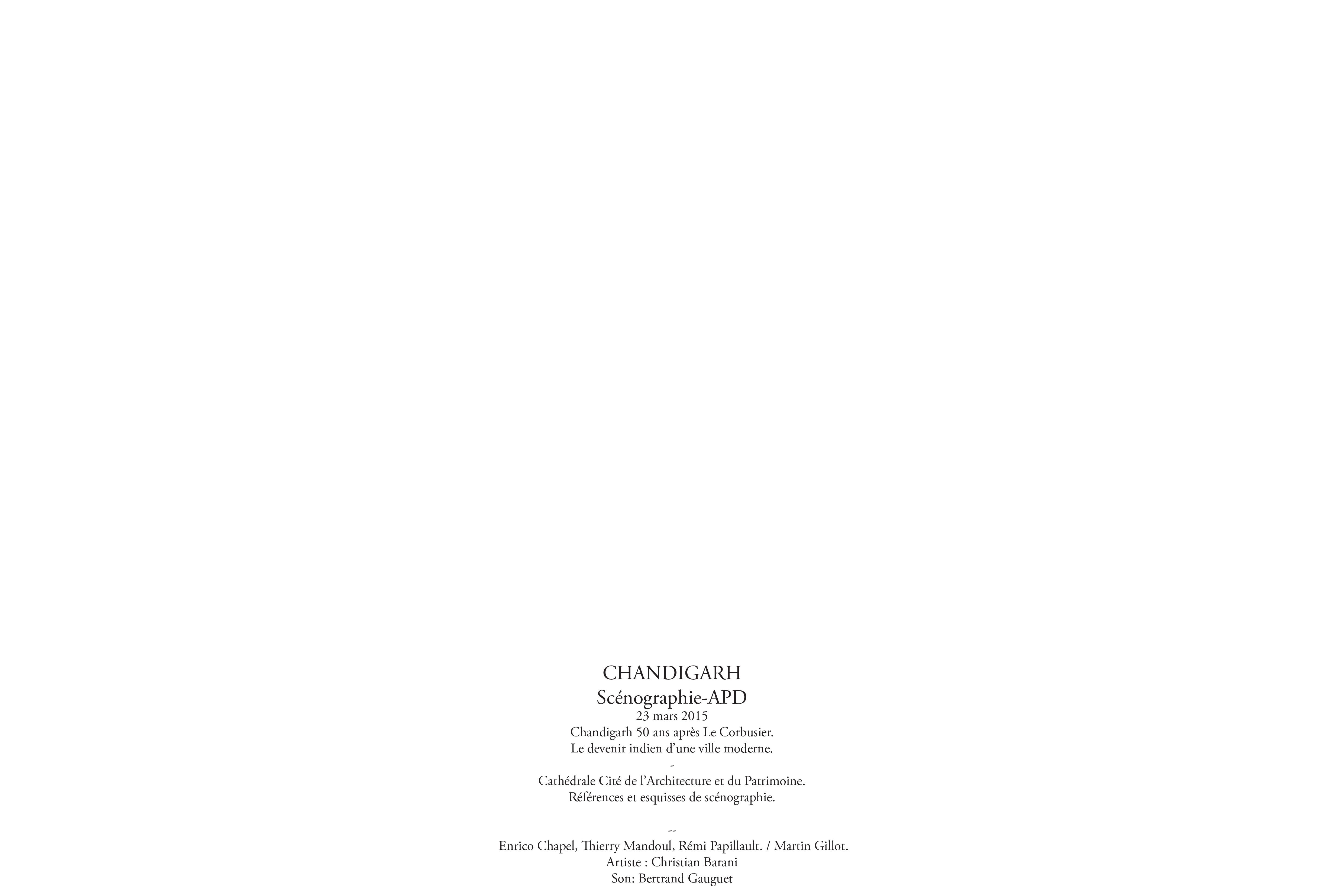 Chandigarh Work in progress 1 10 janvier 2017 Par Thierry Catégorie:Work in Progress Cité de l’Architecture & du Patrimoine Chandigarh 50 ans après Le Corbusier Le devenir indien d’une ville moderne. Du 11 novembre 2015 au 29 février 2016 Palais de Chaillot, 45 Avenue du Président Wilson Exposition créee par la cité de l’Architecture & du Patrimoine Commissariat / Scénographie: Enrico Chapel, Thierry Mandoul et Rémi Papillault Artistes: Christian Barani, Bertrand Gauguet Des esquisses de scénographies à la consultation des entreprises Navigation de l’article Précedent Post précédent Suivant Post suivant